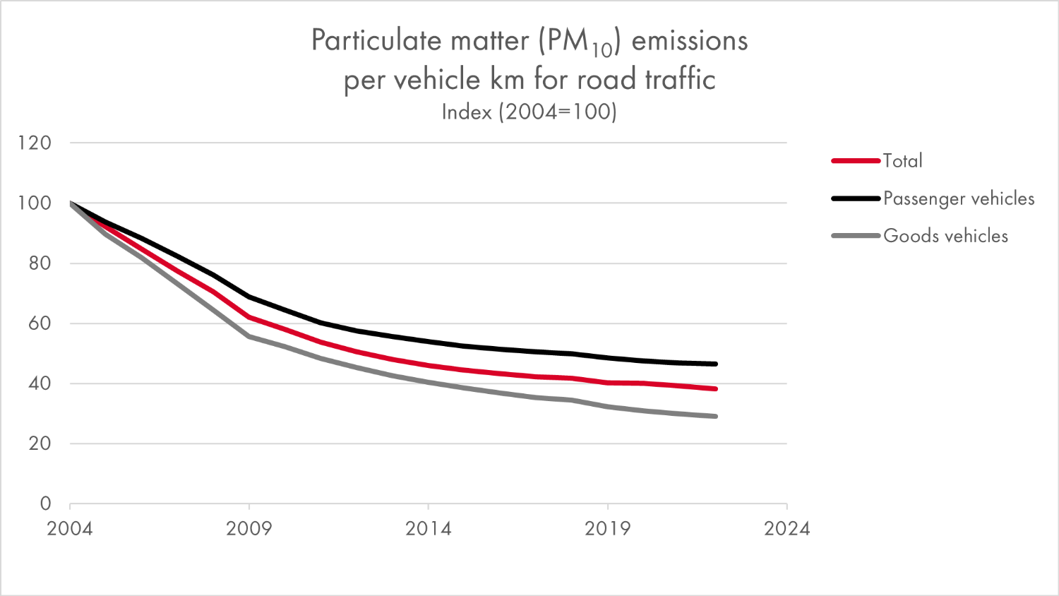 The data shows that since 2004, average emissions of particulate matter PM10 per kilometre by passenger vehicles have fallen by 53%. The introduction of particulate filters in diesel vehicles built after 2000 is the main reason for the sharp reduction.