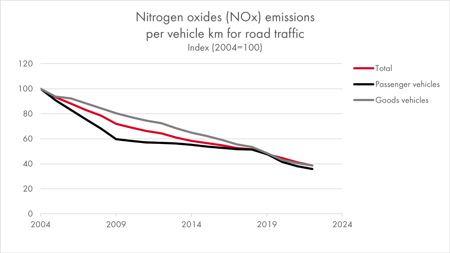 Average emissions per vehicle kilometre of nitrogen oxides (NOx) from passenger transport vehicles have fallen by 64% since 2004. The lower emissions of nitrogen oxides are due to the introduction of increasingly cleaner engines.