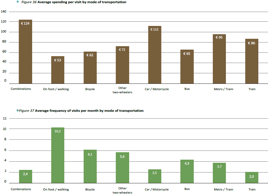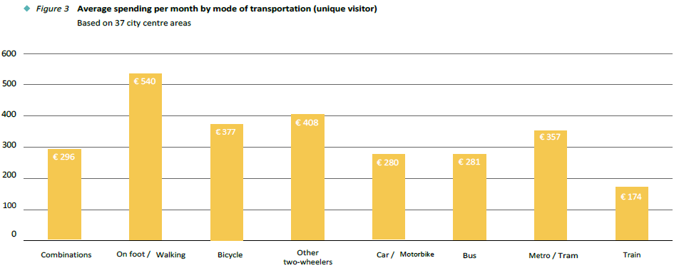 This is almost double the value of a unique visitor by car that brings €280 per month to a city centre area on a monthly basis. In other words, one unique pedestrian equals in economic value almost two unique car visitors.