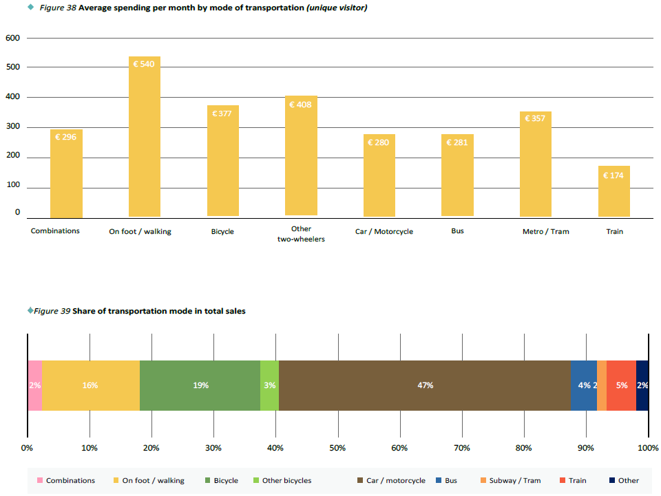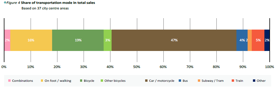 But the car is most important in the share of sales To answer the question of which mode of transportation is most important in total sales, it is not just about the spending of unique visitors on a monthly basis. It is also about the absolute numbers of unique visitors attracted. A city centre which manages to attract proportionately more unique car visitors than unique pedestrians, will, on balance, be more dependent on cars in total sales and vice versa.
