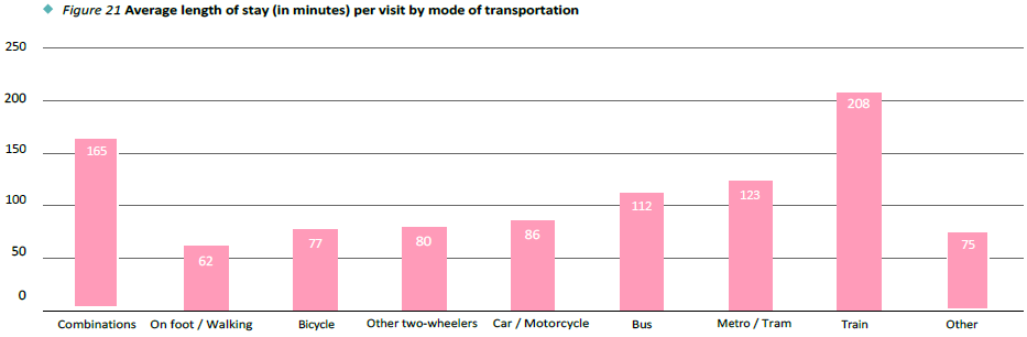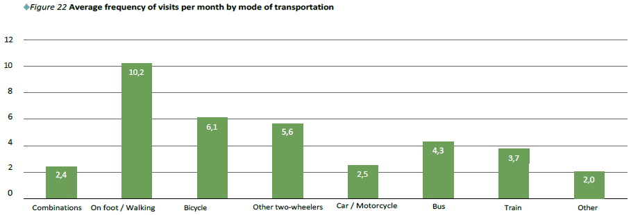 Visitors by bicycle, other two-wheelers and metro/tram are somewhere in between. The other modalities are more comparable to the car in terms of economic value based on unique visitors on a monthly basis.