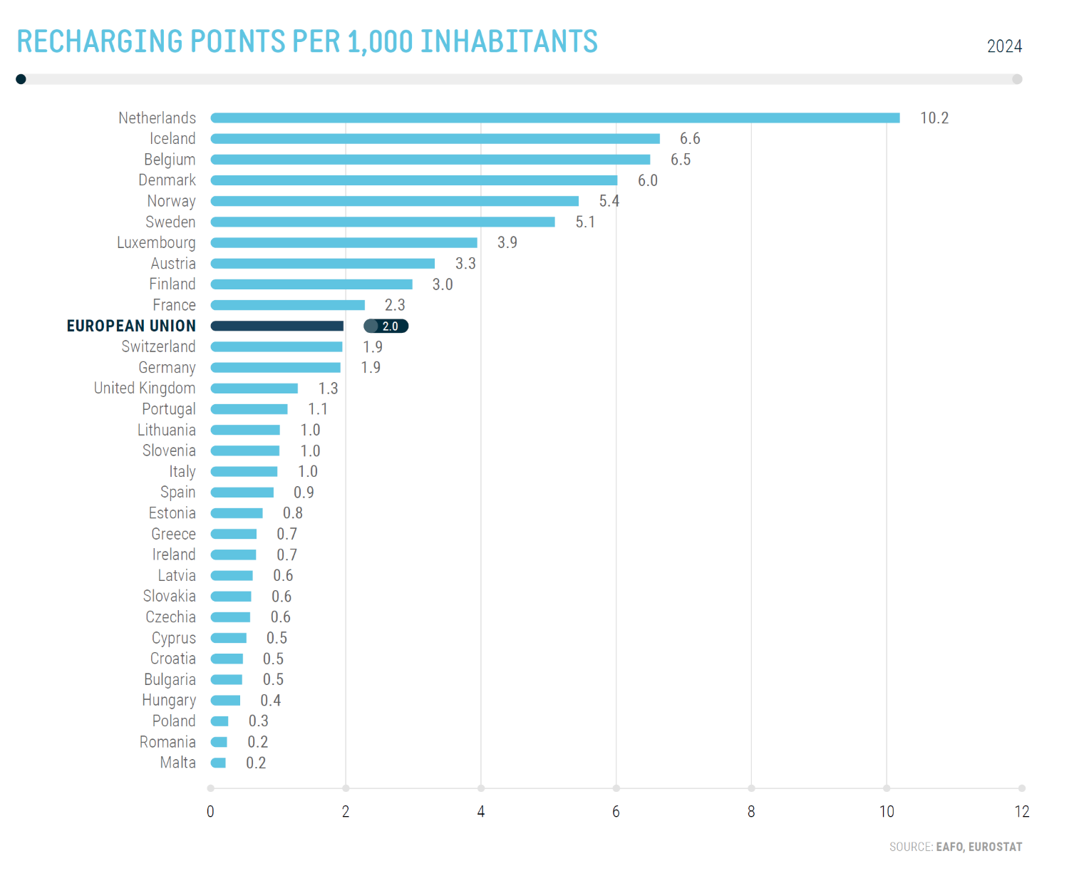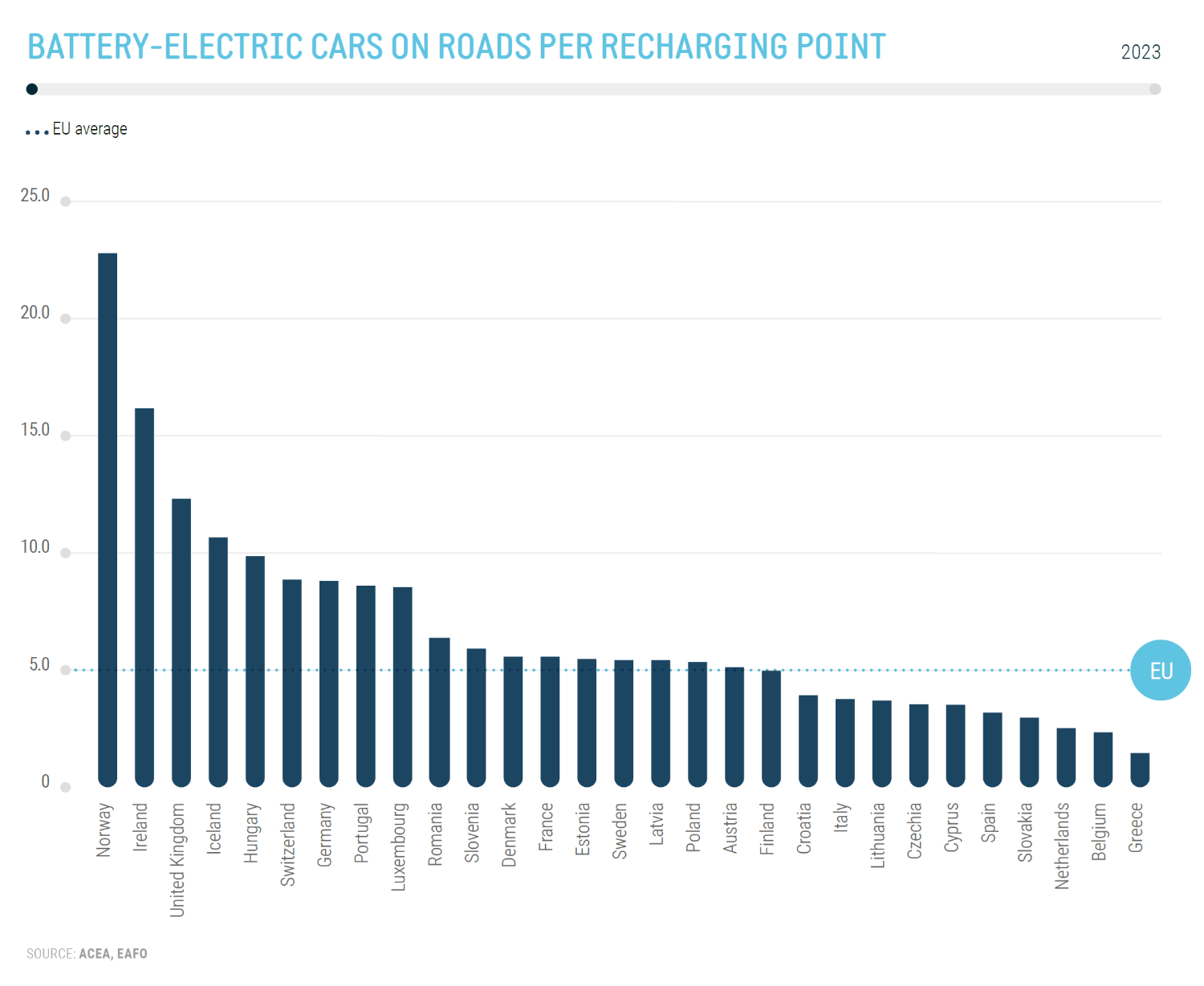 In 2023, there was an average of one public EV charging point for every five BEVs in the EU. And in 2024, there were less than two public charging points per 1,000 inhabitants.