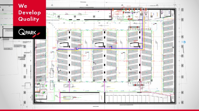 Together we create colour-coded sectional drawings to indicate the coordinated M&E installations for the entire parking facility and each parking deck. These show details including foul and surface water drainage, power cables, electrical supplies, fire alarm positions, sensor positions, lighting, ventilation and water mains.