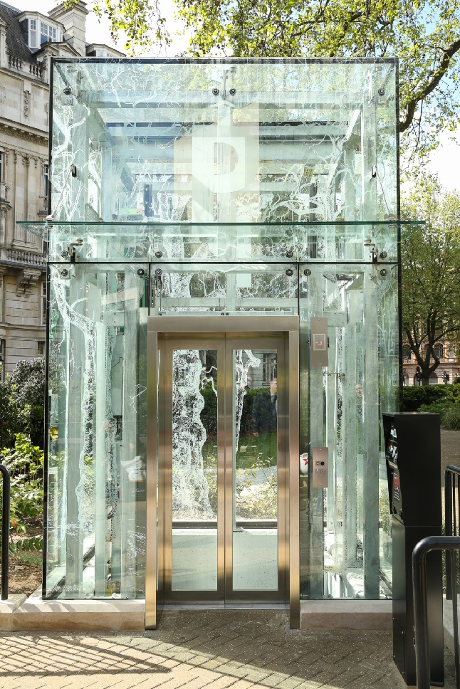 The unique glass lift provides access from Cavendish Square Park down to the underground car park's three sub levels.