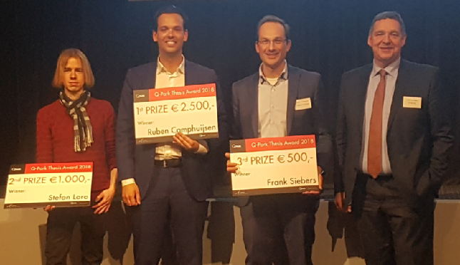 Based on the originality of the topic and the depth of the analysis, a panel of parking experts from the industry have selected Ruben Camphuijsen as the winner. The cheques of EUR 2,500 for the winner, EUR 1,000 for the runner up Stefan Laro and EUR 500 for Frank Siebers were presented by Frank De Moor, CEO of Q-Park.