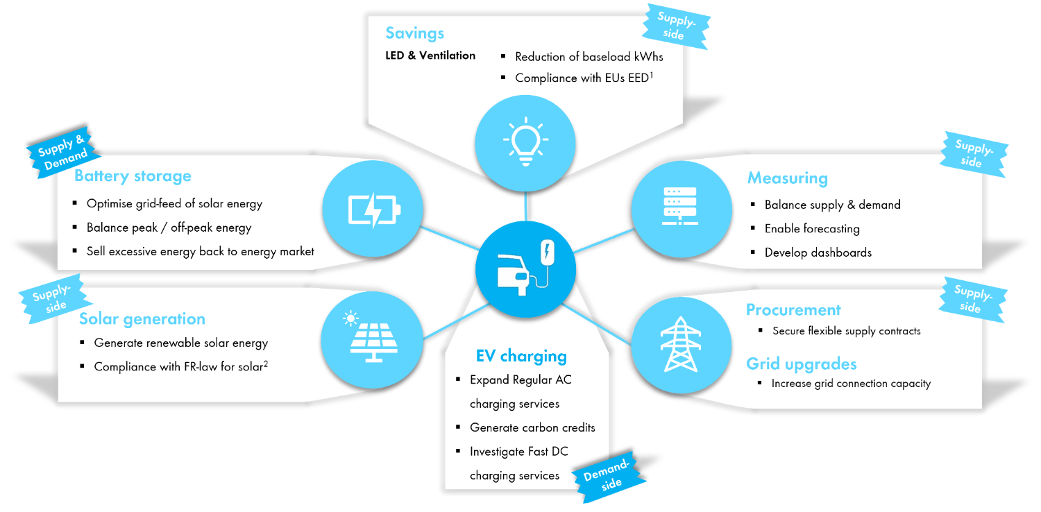 We have developed an energy roadmap to provide a framework for adding sustainable value to our core parking business. This covers the demand and supply sides of our energy management needs.