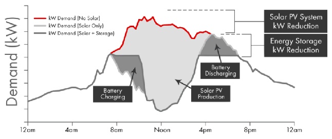 Peak shaving: the added value provided by integrating an energy storage system with a solar energy system. Source: SolarTech.