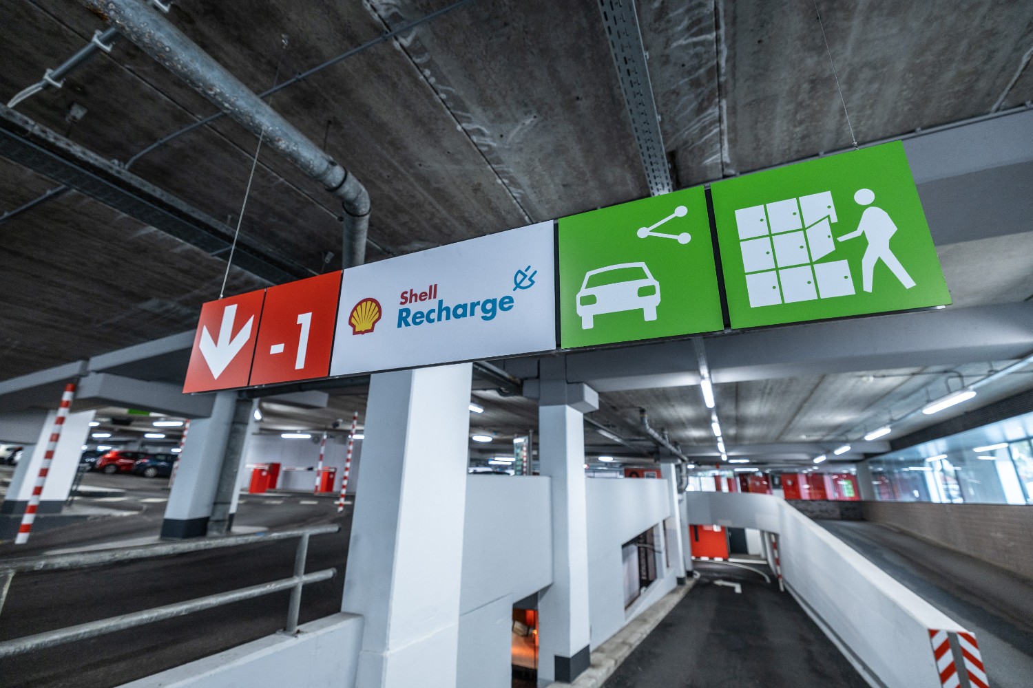 Signs directing customers to Shell fast EV charging on the lower parking deck