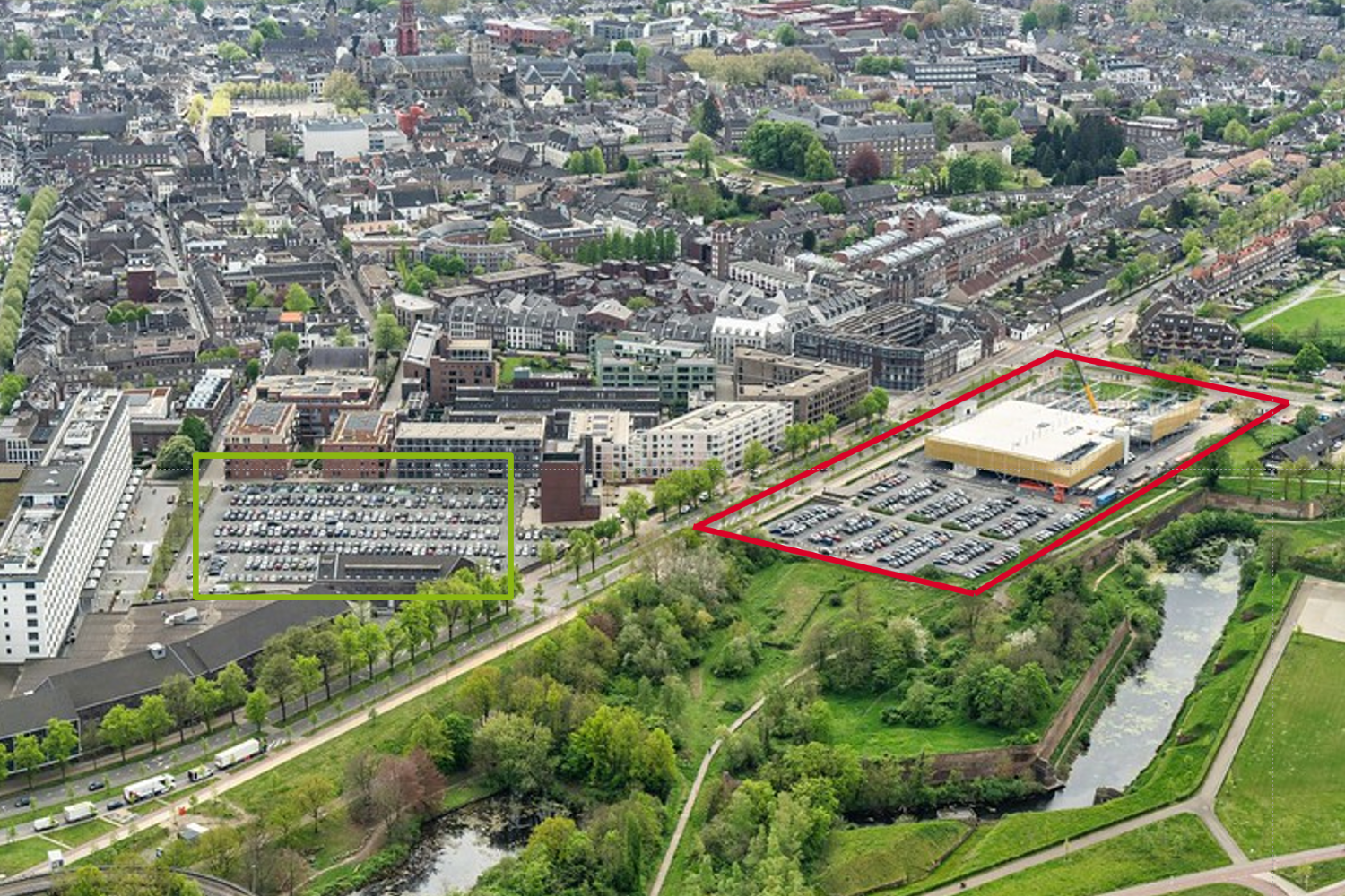 Q-Park Frontenpark (outlined in red) temporarily expanded to serve plans for the Sphinx site (outlined in green) redevelopment.