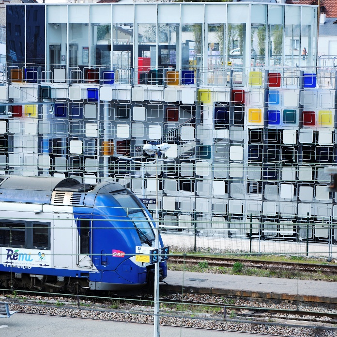 Special attention was paid to the facade, designed as a tribute to the stained-glass windows of Chartres Cathedral, reinforcing the cultural identity and visual harmony of the site. The glass panels create a strong visual signature which is visible from the train station platforms.