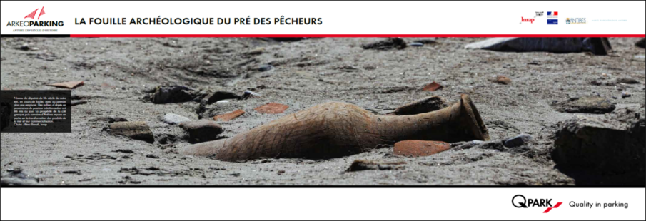 Q-Park and archeologists exhibit large murals photographs of the excavations inside the parking facility.