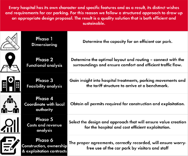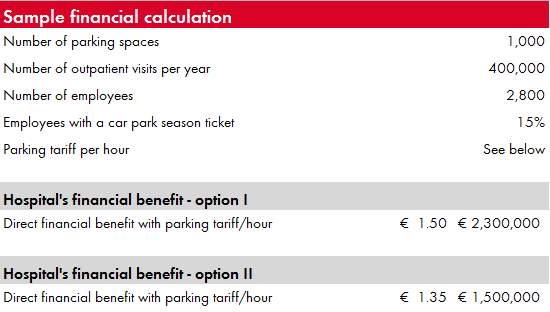 The hospital does, however, keep control over the operational quality and parking tariffs. Specific agreements can be made per location regarding additional, periodic payments to the hospital.