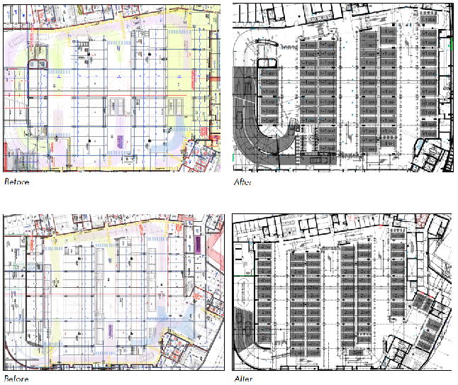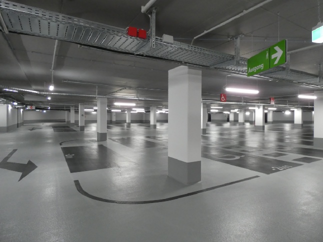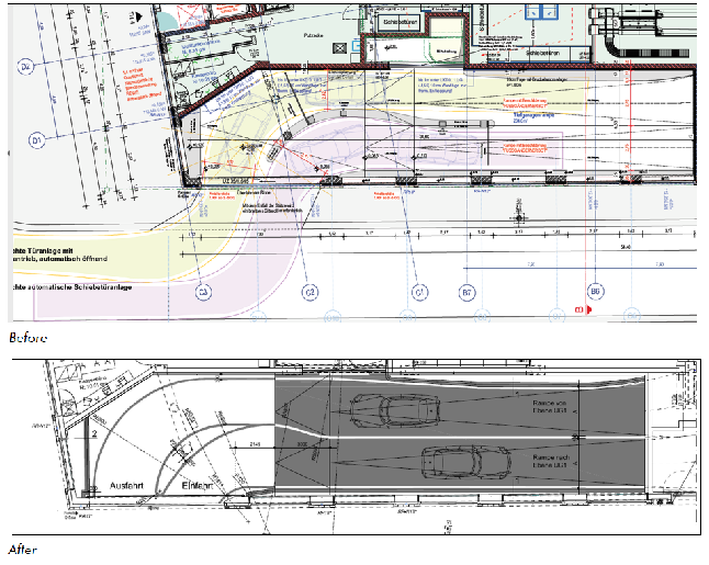 In addition, aisle widths throughout the underground car park were revised and the parking space layout improved. To create additional parking spaces, overlaps were created between adjacent parking spaces for blue badge holders, which each have a width of 3.50 m. This is a practical use of space because it is unlikely that people will get in or out of adjacent vehicles at the same time and require the full width for loading/unloading.