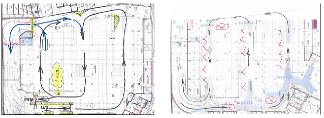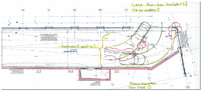 The first step was to analyse the traffic flow and draw in the turning curves. In this phase potential collision points were identified and initial optimisation suggestions incorporated. The next step was to focus on the details.