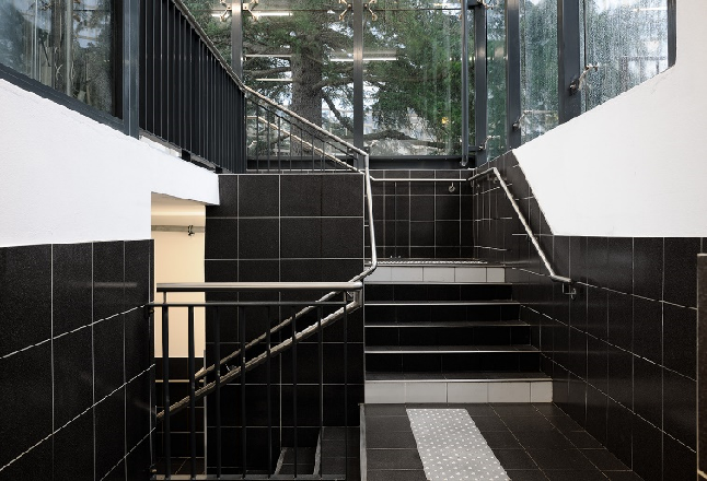 stairwells tiled for easy cleaning.