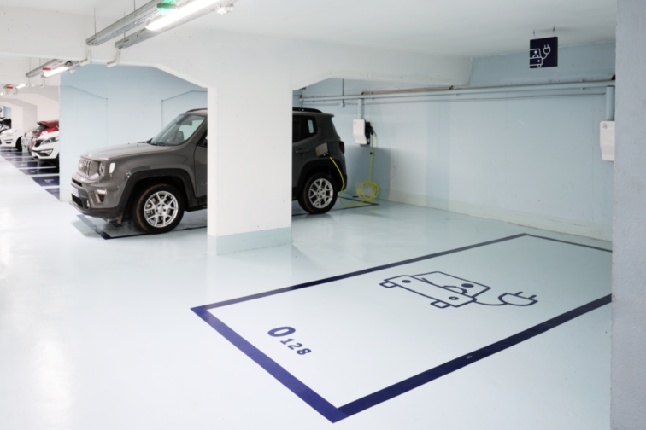 Parking decks are coated in tinted epoxy resin and colour coded according to use. Light blue for traffic and dark blue for pedestrians, to increase visibility.
