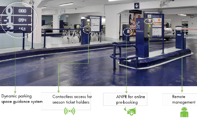 Access and security measures controlled remotely by the Q-Park Control Room (QCR).