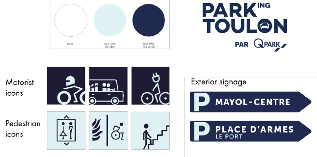 Toulon, in the French Riviera has a large port and long naval history. In the graphic charter, the light and dark shades of blue reflect this Mediterranean setting perfectly. There’s also a selection of new colour-coded icons to guide motorists and pedestrians on street and through the parking facility.