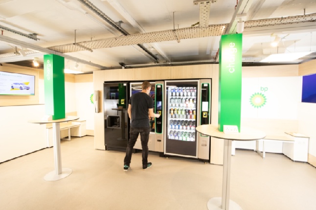 bp Pulse (DC) hub for fleet customers including a lounge area with vending machines and phone charging points for use by UBER and other taxi drivers.